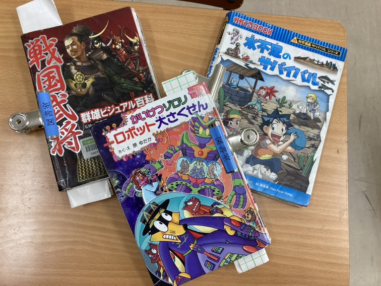 そして今回も人気があり、修繕待ちの多くは「サバイバル」や「かいけつゾロリ」。また子どもたちに読んでもらえるよう、丁寧に作業していただきました。